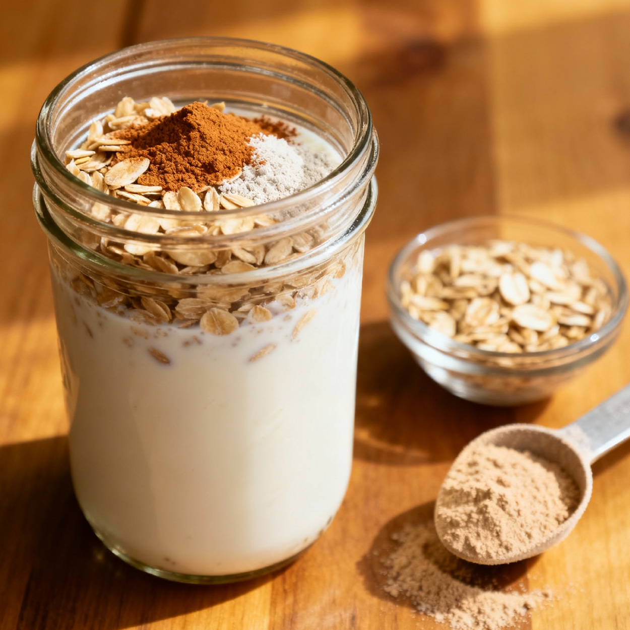 In a jar or bowl, add oats, Bananaboost protein powder, cinnamon, and milk.
