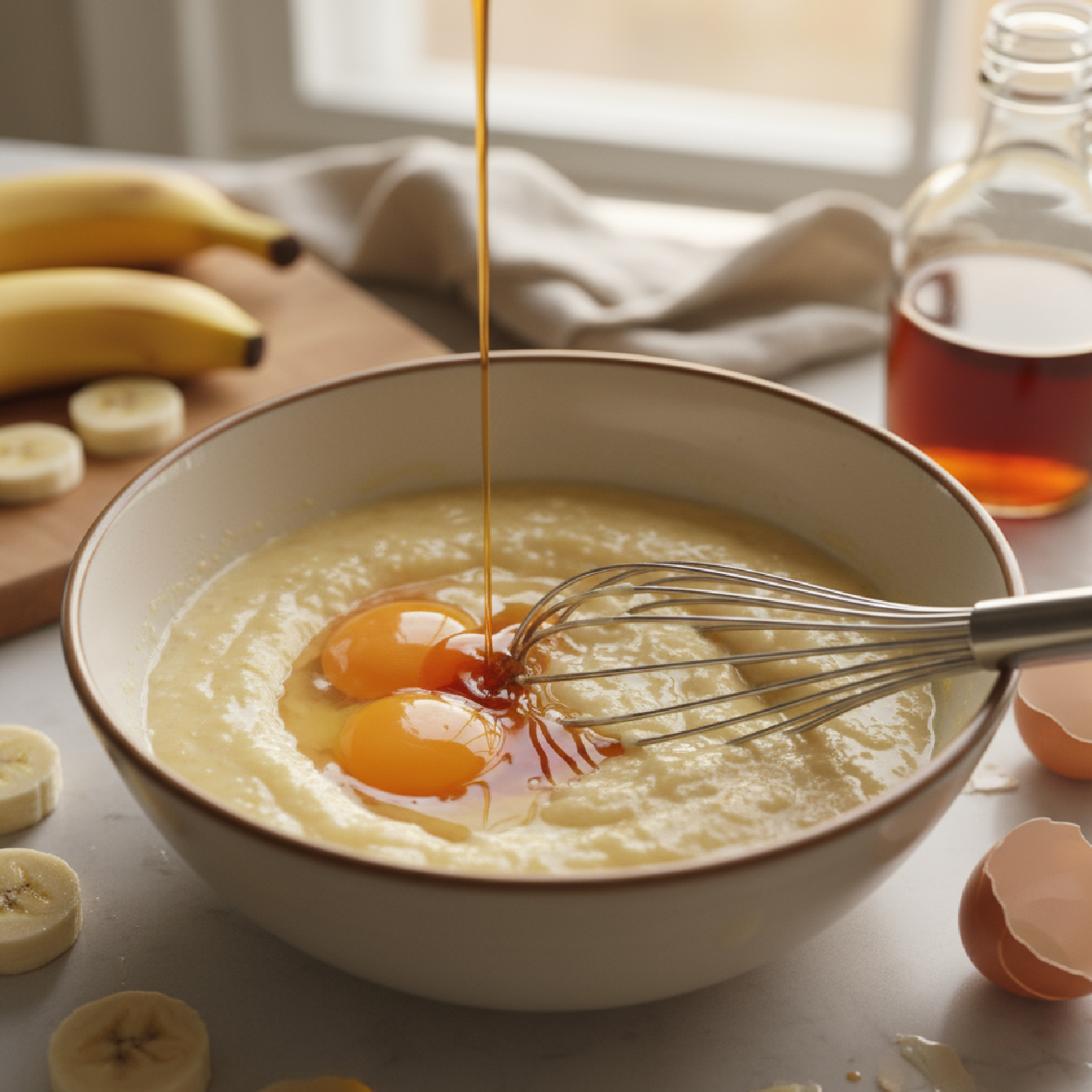 Mash bananas and mix with eggs and maple syrup.