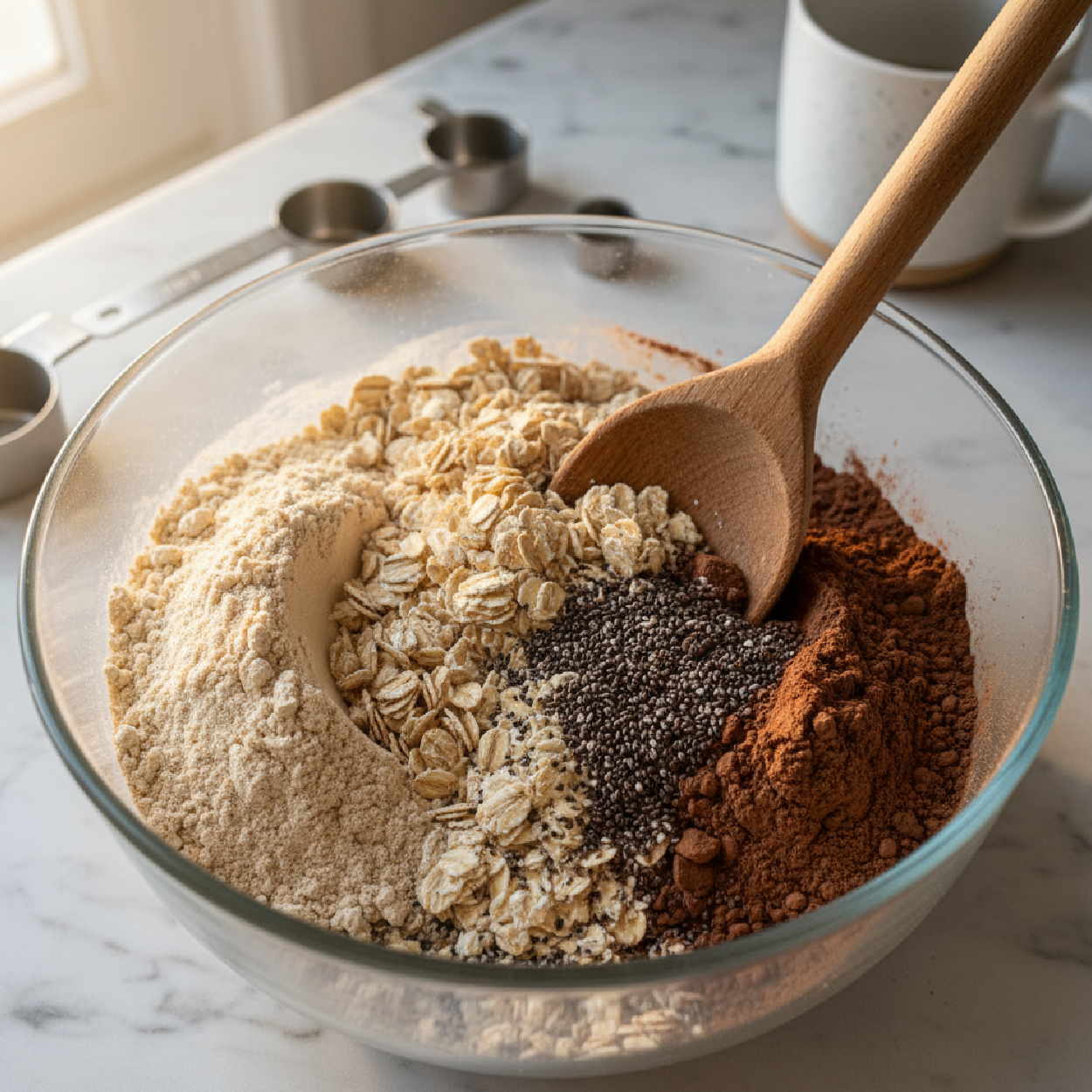 In a mixing bowl, combine protein powder, oats, cocoa powder, and chia seeds (if using)