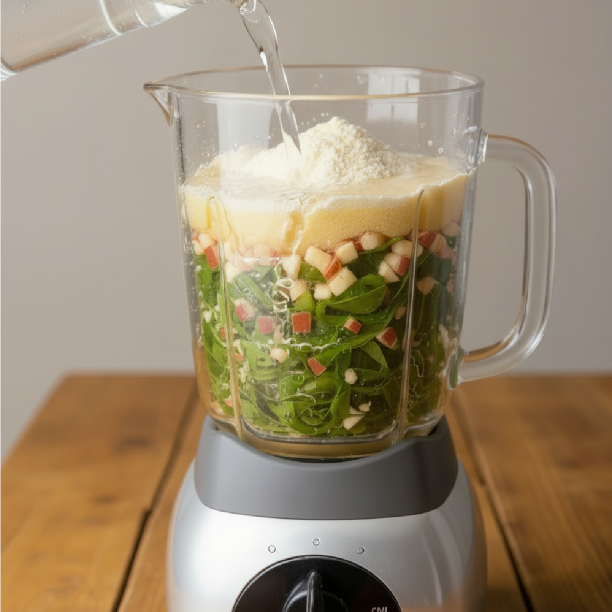 Add all ingredients (protein powder, spinach, apple, and water) into a blender.